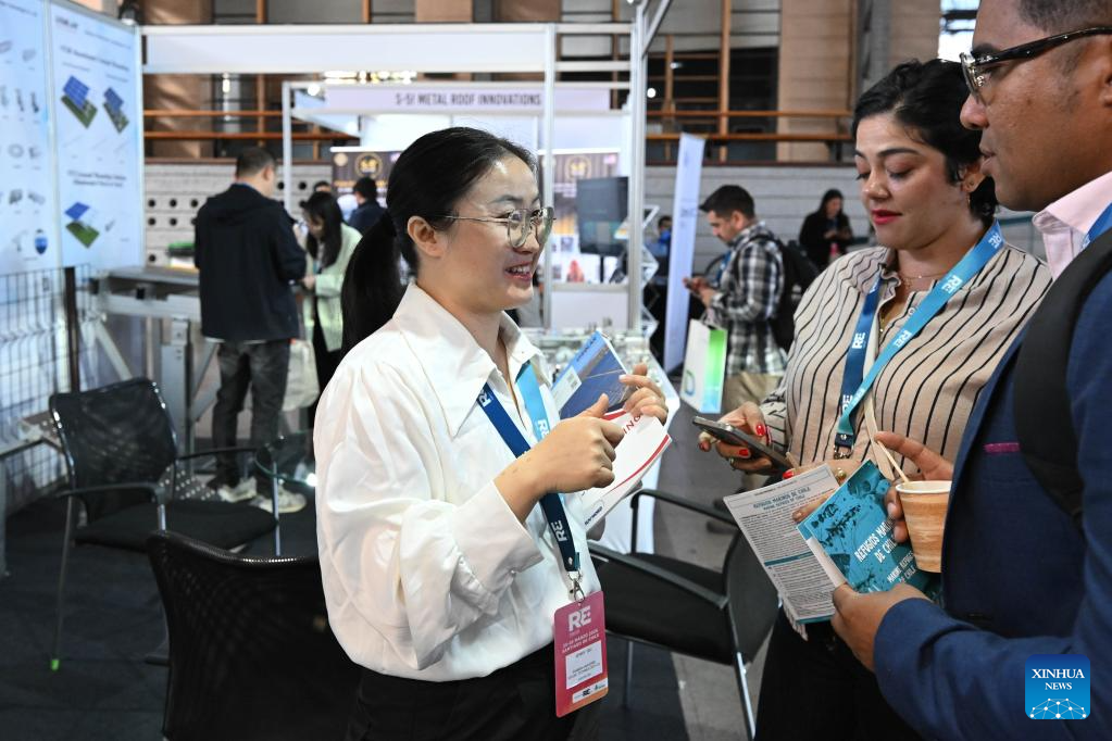 SANTIAGO, 25 marzo, 2026 (Xinhua) -- Una expositora (c) participa en RE+ Cono Sur 2026 en el Centro Cultural Estación Mapocho, en Santiago, capital de Chile, el 25 de marzo de 2026. Autoridades chilenas llamaron el miércoles a buscar oportunidades en las energías renovables en el contexto de la crisis energética global, agravada por el conflicto en Medio Oriente, durante la apertura de RE+ Cono Sur 2026, un encuentro de energías limpias que se organiza por primera vez en Sudamérica. (Xinhua/Jorge Villegas)