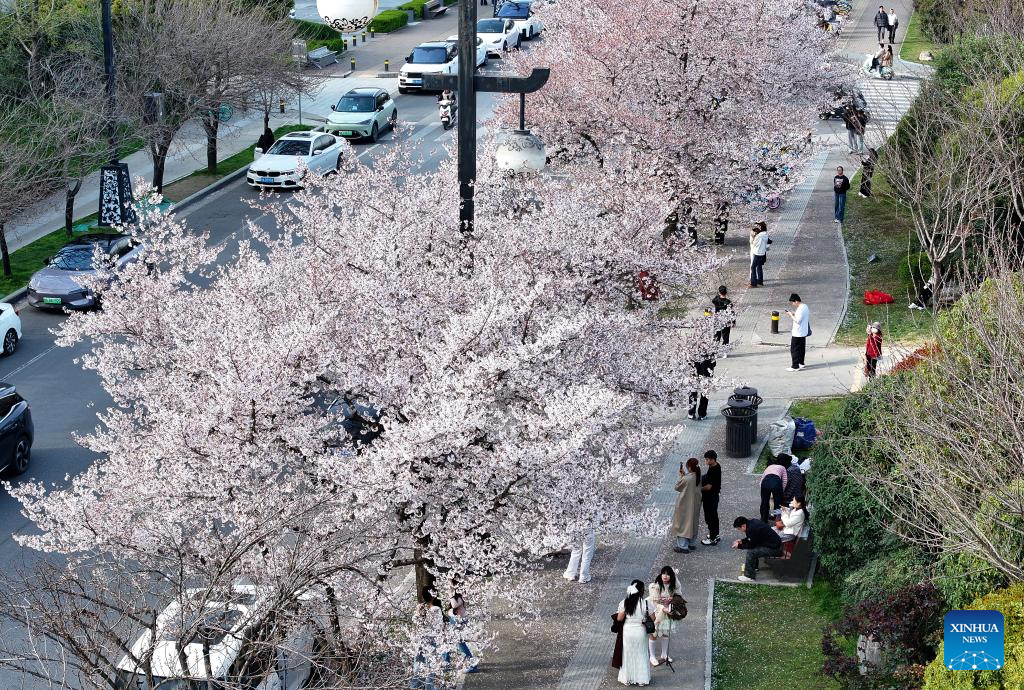 XI'AN, 25 marzo, 2026 (Xinhua) -- Vista aérea tomada con un dron el 24 de marzo de 2026 de personas tomando fotografías bajo árboles de cerezos en flor, en el distrito de Yanta de Xi'an, en la provincia de Shaanxi, en el noroeste de China. Xi'an fue la capital de China durante 13 dinastías, desde la dinastía Zhou Occidental (1046 a. C.-771 a. C.) hasta la dinastía Tang (618-907). Históricamente, era costumbre que los emperadores invitaran a eruditos destacados a banquetes junto al lago Qujiang, que ahora ha sido renovado para convertirlo en un centro vacacional en el sureste de Xi'an. (Xinhua/Shao Rui)
