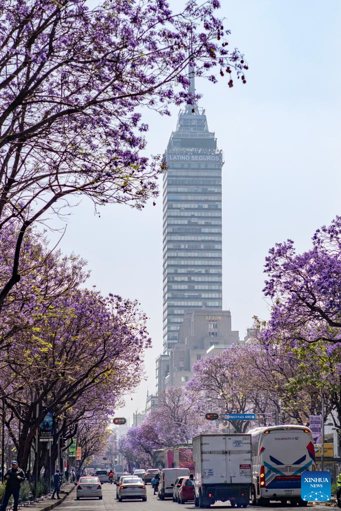 CIUDAD DE MEXICO, 26 marzo, 2026 (Xinhua) -- Imagen del 25 de marzo de 2026 de árboles de jacaranda en una calle frente a la Torre Latinoamericana, en la Ciudad de México, capital de México. (Xinhua/Li Muzi)