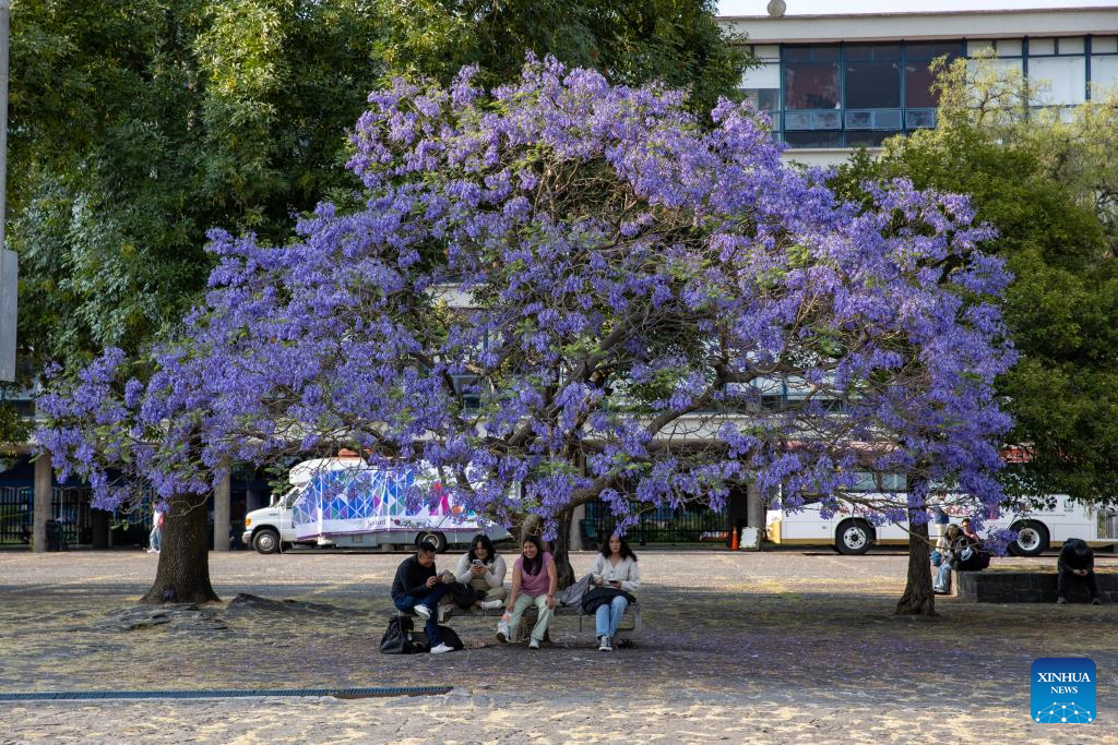 CIUDAD DE MEXICO, 26 marzo, 2026 (Xinhua) -- Imagen del 24 de marzo de 2026 de personas descansando bajo un árbol de jacaranda en el campus principal de la Universidad Nacional Autónoma de México, en la Ciudad de México, capital de México. (Xinhua/Qi Xiaoyi)