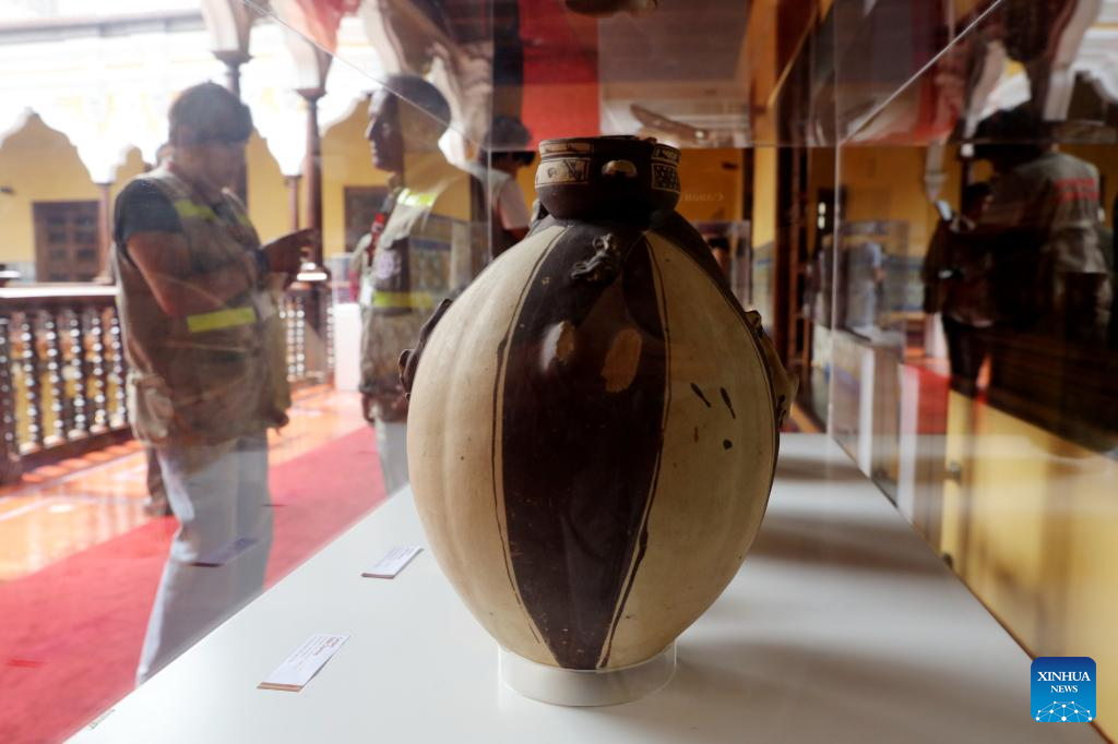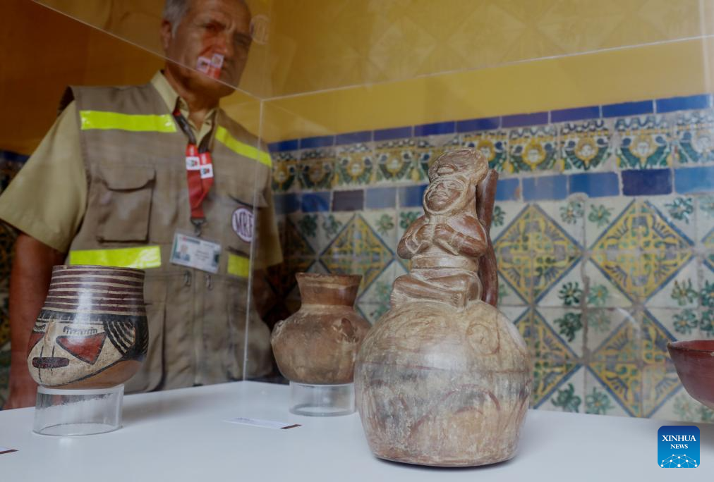 LIMA, 27 marzo, 2026 (Xinhua) -- Un trabajador observa bienes culturales repatriados durante una ceremonia oficial de entrega de piezas patrimoniales, en Lima, Perú, el 27 de marzo de 2026. Perú recibió oficialmente el viernes un total de 169 bienes culturales repatriados desde 13 países de América, Europa y Asia, en la primera ceremonia oficial de entrega de piezas patrimoniales del año 2026, celebrada en la sede de la cancillería de Lima. (Xinhua/Mariana Bazo)