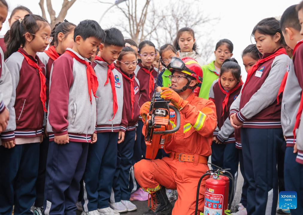 BEIJING, 30 marzo, 2026 (Xinhua) -- Un bombero le enseña a estudiantes a usar herramientas de rescate de incendio en una escuela primaria, en la ciudad de Rongcheng, en la provincia de Shandong, en el este de China, el 30 de marzo de 2026. El 30 de marzo se celebra en China el día nacional de la educación sobre seguridad para los alumnos de primaria y secundaria. (Xinhua/Li Xinjun)