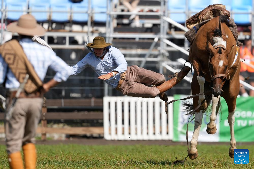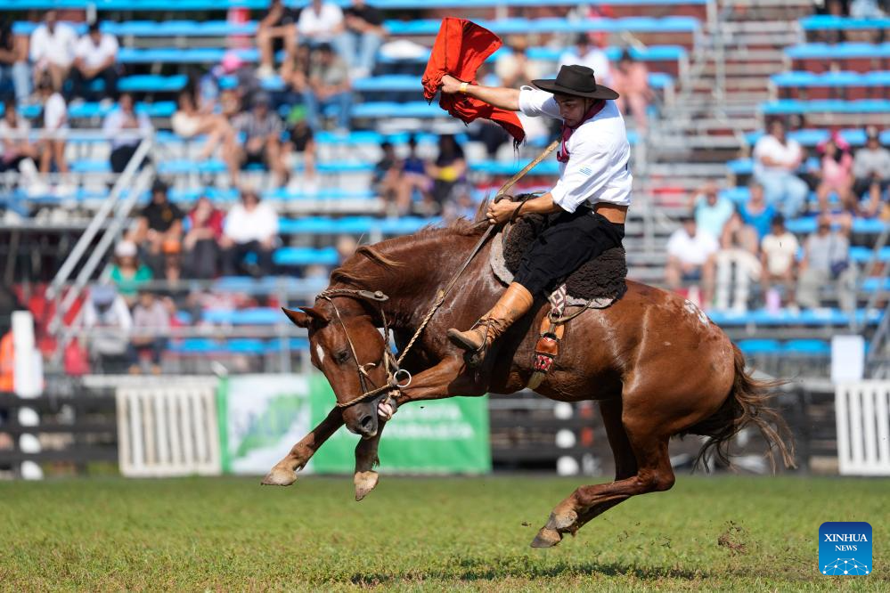MONTEVIDEO, 30 marzo, 2026 (Xinhua) -- Un gaucho monta un caballo en las jineteadas durante la 99 edición de la Semana Criolla del Prado, en el rodeo de la Rural del Prado, en Montevideo, capital de Uruguay, el 30 de marzo de 2026. (Xinhua/Nicolás Celaya)
