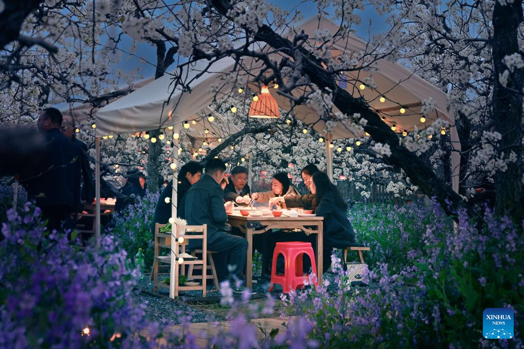 DANGSHAN, 1 abril, 2026 (Xinhua) -- Imagen del 30 de marzo de 2026 de personas cenando en un jardín de perales, en el distrito de Dangshan, en la provincia de Anhui, en el este de China. Ahora que los perales en el distrito de Dangshan de Anhui han entrado en plena floración, diversas actividades se llevan a cabo aquí para atraer turistas. (Xinhua/Cui Meng)