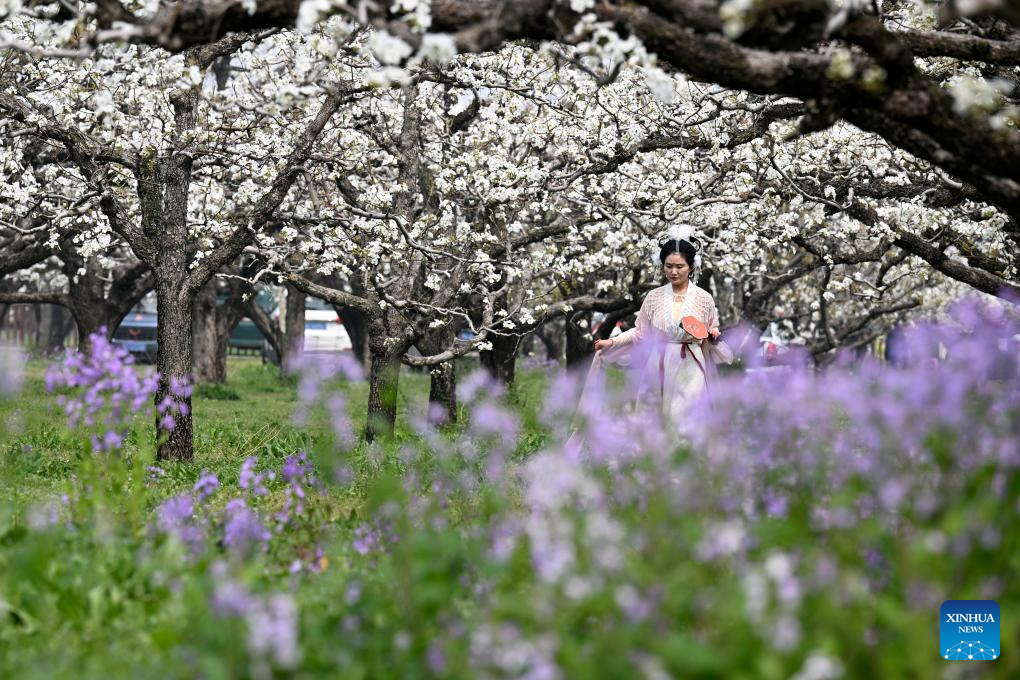 DANGSHAN, 1 abril, 2026 (Xinhua) -- Imagen del 31 de marzo de 2026 de una turista visitando un jardín de perales, en el distrito de Dangshan, en la provincia de Anhui, en el este de China. Ahora que los perales en el distrito de Dangshan de Anhui han entrado en plena floración, diversas actividades se llevan a cabo aquí para atraer turistas. (Xinhua/Huang Bohan)