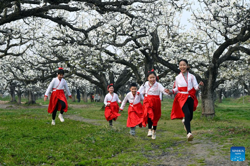 DANGSHAN, 1 abril, 2026 (Xinhua) -- Imagen del 31 de marzo de 2026 de niños corriendo en un jardín de perales, en el distrito de Dangshan, en la provincia de Anhui, en el este de China. Ahora que los perales en el distrito de Dangshan de Anhui han entrado en plena floración, diversas actividades se llevan a cabo aquí para atraer turistas. (Xinhua/Cui Meng)
