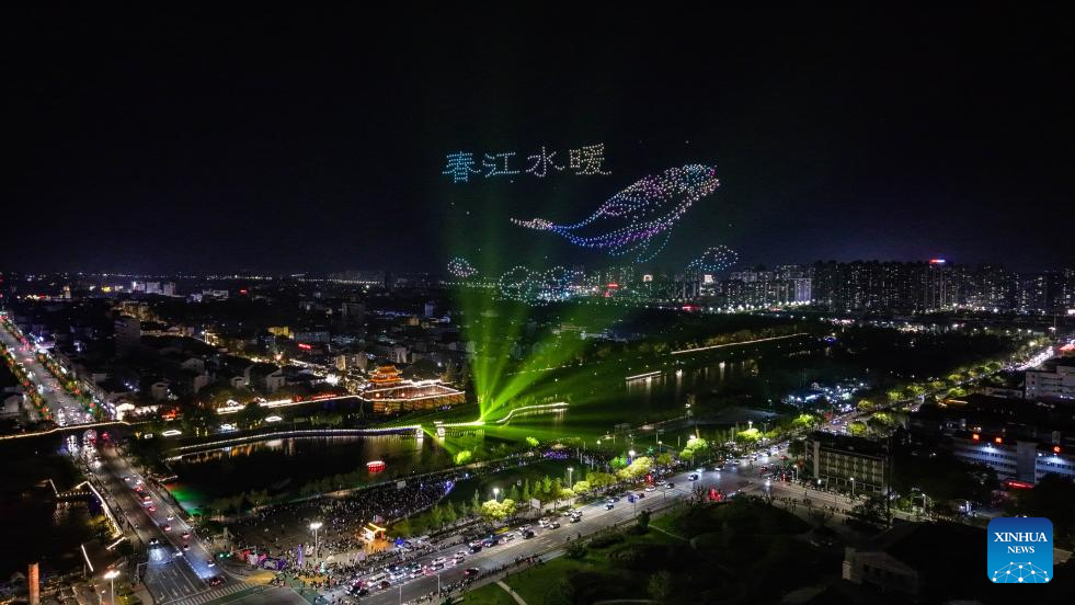 JINGZHOU, 4 abril, 2026 (Xinhua) -- Imagen del 3 de abril de 2026 de un espectáculo de drones llevado, a cabo cerca de la ciudad antigua de Jingzhou, en la provincia de Hubei, en el centro de China. El espectáculo, cuyo objetivo era impulsar el turismo cultural primaveral se representó aquí el viernes por la noche y atrajo a muchos visitantes. (Xinhua/Wu Taotao)