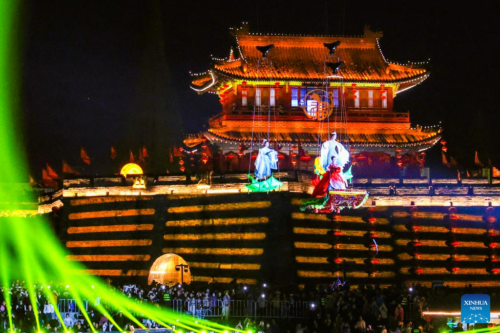 JINGZHOU, 4 abril, 2026 (Xinhua) -- Imagen del 3 de abril de 2026 de una presentación llevada a cabo, en las afueras de la ciudad antigua de Jingzhou, en la provincia de Hubei, en el centro de China. El espectáculo, cuyo objetivo era impulsar el turismo cultural primaveral se representó aquí el viernes por la noche y atrajo a muchos visitantes. (Xinhua/Zhang Mengyao)