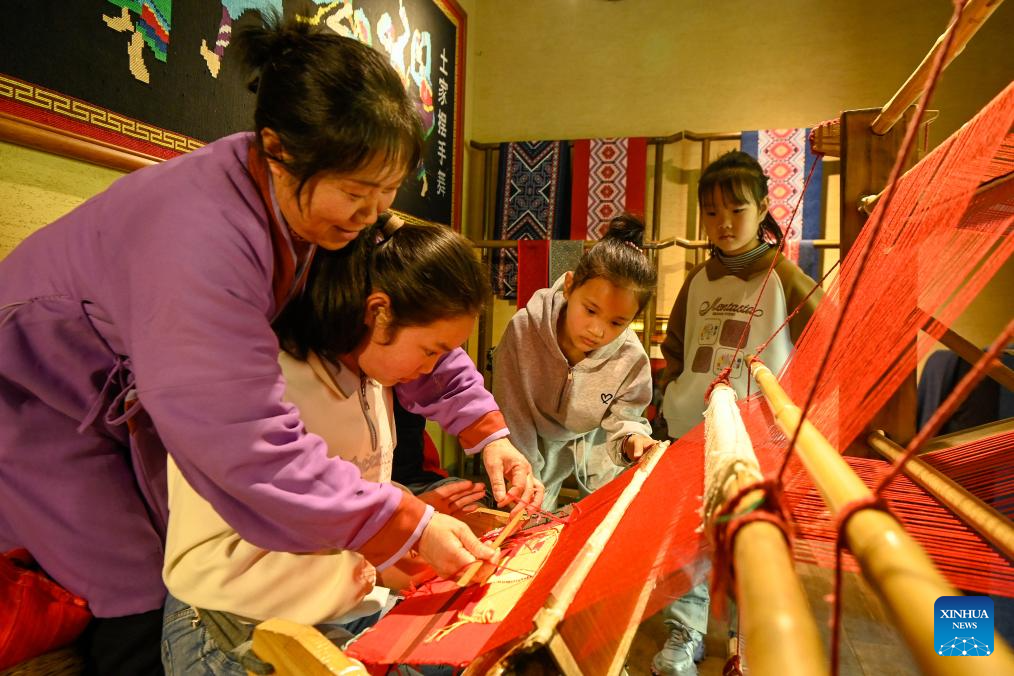 BEIJING, 4 abril, 2026 (Xinhua) -- Imagen del 3 de abril de 2026 de niños aprendiendo sobre las habilidades de tejido de brocado tujia bajo la guía de un heredero del patrimonio cultural inmaterial (ICH, por sus siglas en inglés) en un taller de brocado del ICH en el área escénica de Taohuayuan, en el distrito autónomo tujia y miao de Youyang, en Chongqing, en el suroeste de China. Las primeras vacaciones de primavera del país para escuelas primarias y secundarias cayó justo antes del feriado de tres días del Festival Qingming, que va del sábado al lunes, en muchas localidades. Los estudiantes tuvieron la oportunidad de participar en una variedad de actividades de ocio. (Xinhua/Qiu Hongbin)