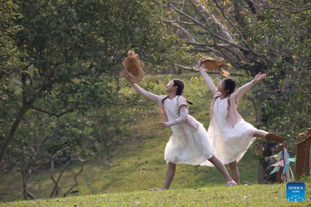 BEIJING, 4 abril, 2026 (Xinhua) -- Dos estudiantes se divierten en el Jardín Botánico Tropical de Xishuangbanna de la Academia de Ciencias de China, en el distrito de Mengla, en la prefectura autónoma dai de Xishuangbanna, en la provincia de Yunnan, en el suroeste de China, el 4 de abril de 2026. Las primeras vacaciones de primavera del país para escuelas primarias y secundarias cayó justo antes del feriado de tres días del Festival Qingming, que va del sábado al lunes, en muchas localidades. Los estudiantes tuvieron la oportunidad de participar en una variedad de actividades de ocio. (Xinhua/Li Yunsheng)