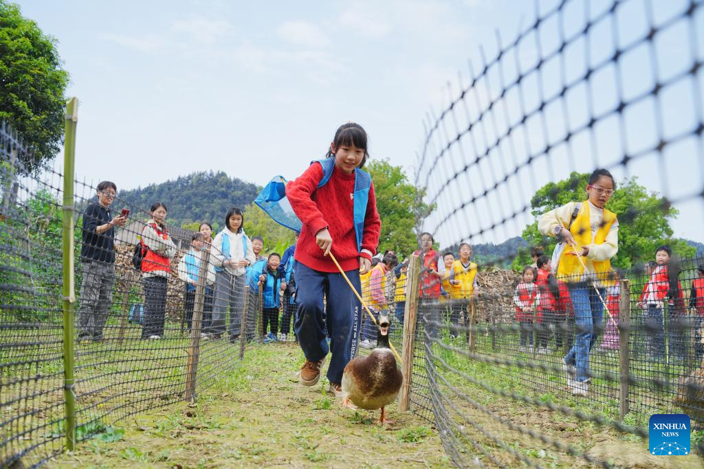 BEIJING, 4 abril, 2026 (Xinhua) -- Imagen del 3 de abril de 2026 de niños participando en una competencia de persecución de patos en una granja, en la aldea de Hutou de Chongqing, en el suroeste de China. Las primeras vacaciones de primavera del país para escuelas primarias y secundarias cayó justo antes del feriado de tres días del Festival Qingming, que va del sábado al lunes, en muchas localidades. Los estudiantes tuvieron la oportunidad de participar en una variedad de actividades de ocio. (Xinhua/Qin Tingfu)