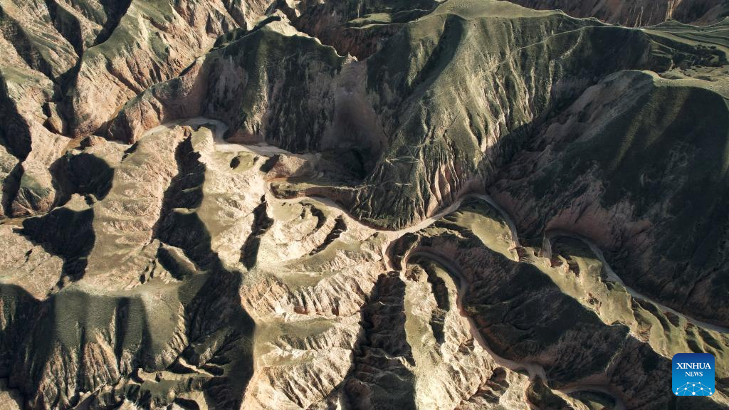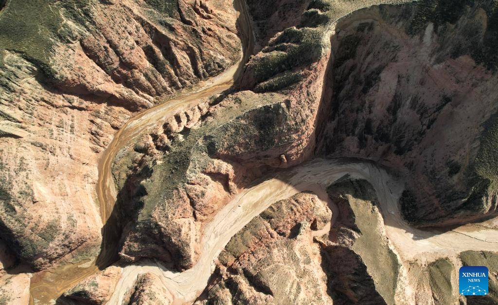 DONGXIANG, 5 abril, 2026 (Xinhua) -- Vista aérea tomada con un dron el 4 de abril de 2026 del relieve de Danxia en el cañón Shilaquan, en el poblado de Tangwang del distrito autónomo de Dongxiang, prefectura autónoma hui de Linxia, en la provincia de Gansu, en el noroeste de China. El cañón Shilaquan tiene una elevación promedio de aproximadamente 2.000 metros. Las capas de arenisca roja y grava a ambos lados del cañón han sido modeladas por la erosión hídrica y la abrasión del viento, formando un relieve distintivo de Danxia. (Xinhua/Chen Bin)