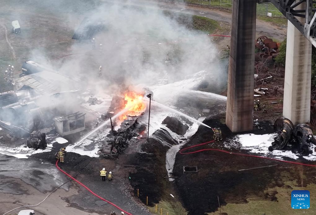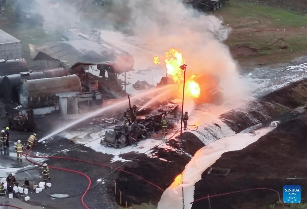 Captura de pantalla de un video tomado con un dron el 6 de abril de 2026 de bomberos trabajando en el sitio de un incendio provocado por la explosión de un camión cisterna, en la Ciudad de Panamá, capital de Panamá. La explosión de un camión cisterna en Ciudad de Panamá dejó el lunes una persona muerta y varias otras heridas, informaron las autoridades. (Xinhua/HO)