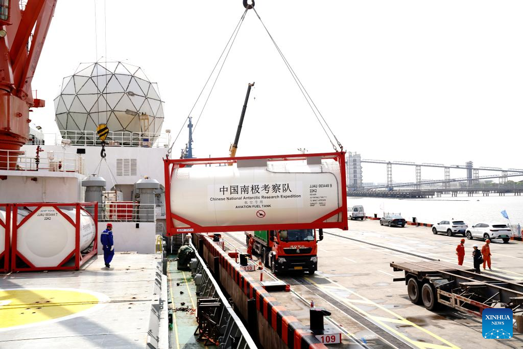 Trabajadores descargan contenedores del rompehielos de investigación chino Xuelong, en Shanghai, en el este de China, el 9 de abril de 2026. El rompehielos de investigación chino Xuelong, o Dragón de Nieve, regresó el jueves a la municipalidad oriental de Shanghai después de un viaje de 160 días que formó parte de la 42ª expedición antártica del país. (Xinhua/Zhang Jiansong)