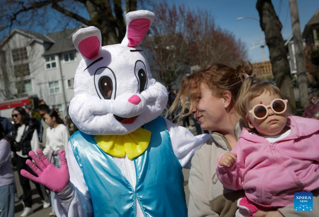 DELTA, 6 abril, 2026 (Xinhua) -- Imagen del 5 de abril de 2026 de un artista disfrazado del Conejo de Pascua interactuando con las personas durante el Desfile anual de Pascua, en el pueblo de Ladner, en Delta, Columbia Británica, Canadá. El evento anual de Pascua, una tradición comunitaria de más de 60 años, incluyó un desfile festivo y actividades orientadas a la familia, atrayendo a los residentes locales para celebrar la festividad. (Xinhua/Liang Sen)