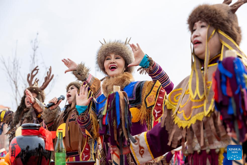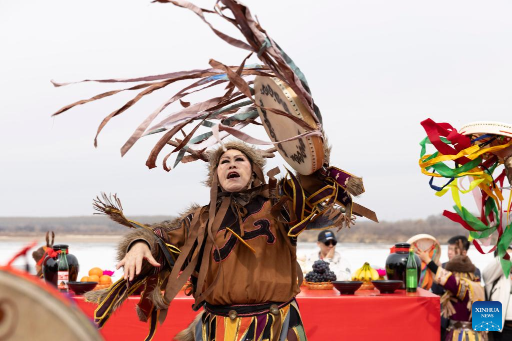 JIAMUSI, 10 abril, 2026 (Xinhua) -- Una ceremonia de bendición realizada por artistas del grupo étnico hezhe se lleva a cabo en el festival Hanjiang, en Jiamusi, en la provincia de Heilongjiang, en el noreste de China, el 10 de abril de 2026. El festival Hanjiang, un ritual que marca el deshielo de primavera y en el que se ora por una cosecha abundante, comenzó aquí el viernes. (Xinhua/Zhang Tao)