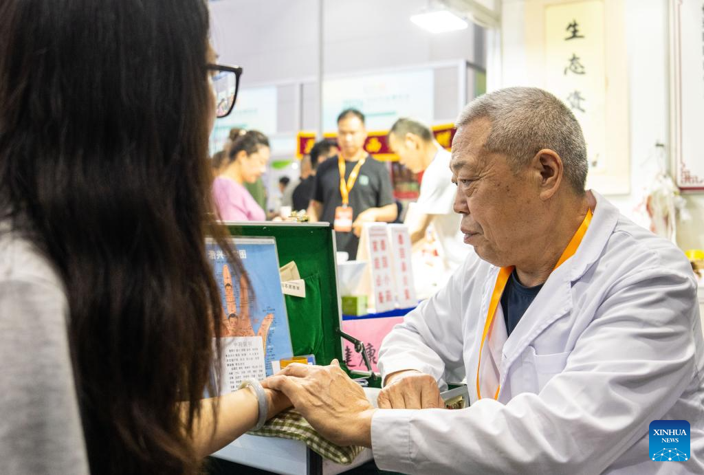 CHANGSHA, 10 abril, 2026 (Xinhua) -- Un doctor de Medicina Tradicional China realiza un diagnóstico de pulso para una visitante en la Exposición Agrícola de Medicina China en el Centro Internacional de Convenciones y Exposiciones de Hunan, en Changsha, en la provincia de Hunan, en el centro de China, el 10 de abril de 2026. Con un área de exposición total de 20.000 metros cuadrados, la primera edición de la Exposición Agrícola de Medicina China comenzó aquí el viernes, reuniendo a más de 300 expositores de todo el país. (Xinhua/Chen Sihan)