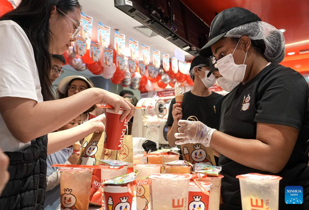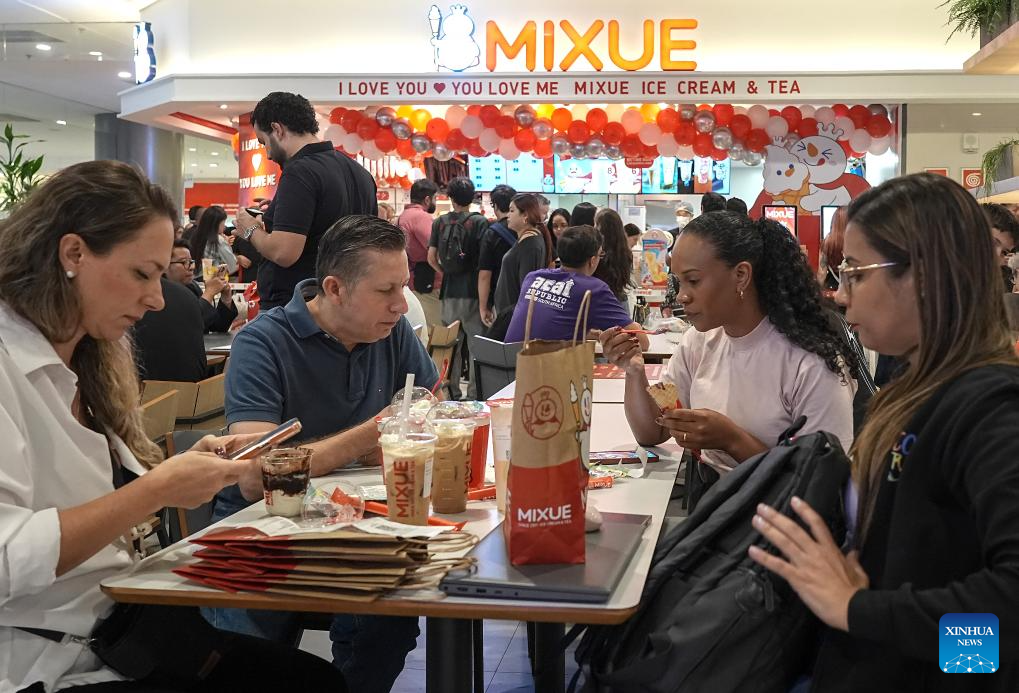 SAO PAULO, 11 abril, 2026 (Xinhua) -- Clientes degustan productos en la primera tienda china Mixue en Brasil durante su inauguración en un centro comercial, en Sao Paulo, Brasil, el 11 de abril de 2026. Mixue abrió su primera tienda en Brasil y según un representante de la empresa también comenzará la construcción de una fábrica para su cadena de suministro en el país. Se espera que genere 25.000 empleos en el futuro. (Xinhua/Paulo Lopes)