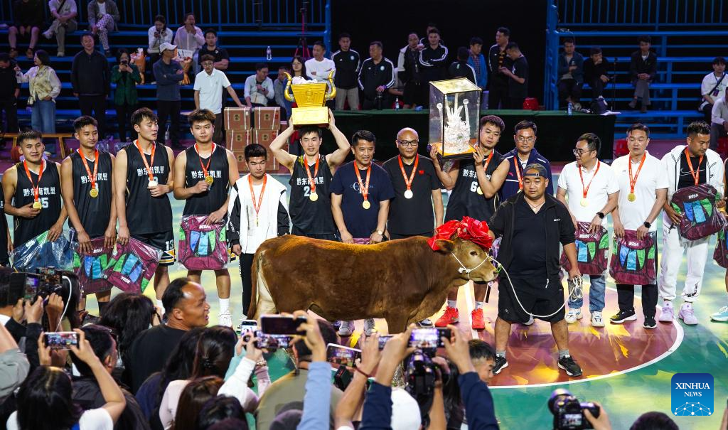 TAIJIANG, 12 abril, 2026 (Xinhua) -- Imagen del 11 de abril de 2026 del equipo ganador Kaili festejando con un buey como premio después del partido final entre la ciudad de Kaili y el distrito de Yanhe durante la Competencia de Baloncesto Rural de China 2026, en la aldea de Taipan, en el distrito de Taijiang, en la provincia de Guizhou, en el suroeste de China. (Xinhua/Yang Wenbin)