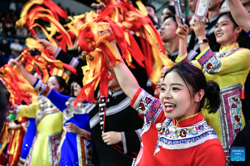 TAIJIANG, 12 abril, 2026 (Xinhua) -- Imagen del 11 de abril de 2026 de aficionados portando trajes étnicos mientras animan durante el partido final entre la ciudad de Kaili y el distrito de Yanhe en la Competencia de Baloncesto Rural de China 2026, en la aldea de Taipan, en el distrito de Taijiang, en la provincia de Guizhou, en el suroeste de China. (Xinhua/Yang Wenbin)