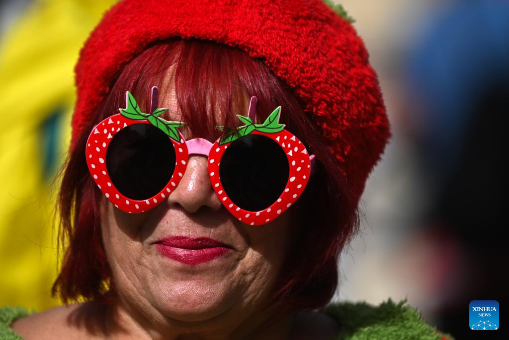 MGARR, 12 abril, 2026 (Xinhua) -- Una mujer porta unas gafas con forma de fresa durante el festival de la fresa, en Mgarr, Malta, el 12 abril de 2026. Malta llevó a cabo su festival anual de la fresa en Mgarr el domingo. (Xinhua/Jonathan Borg)