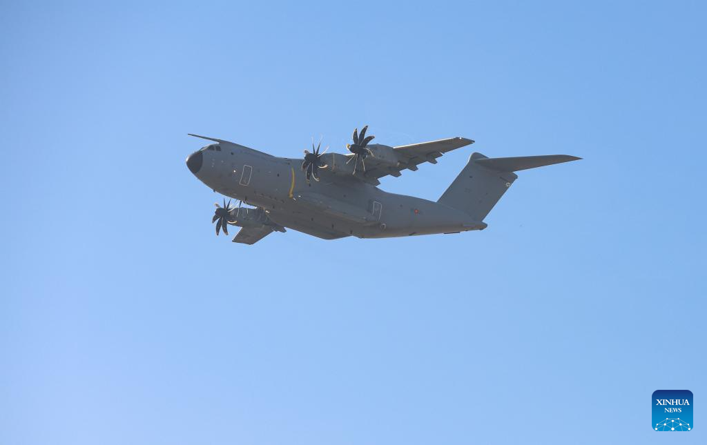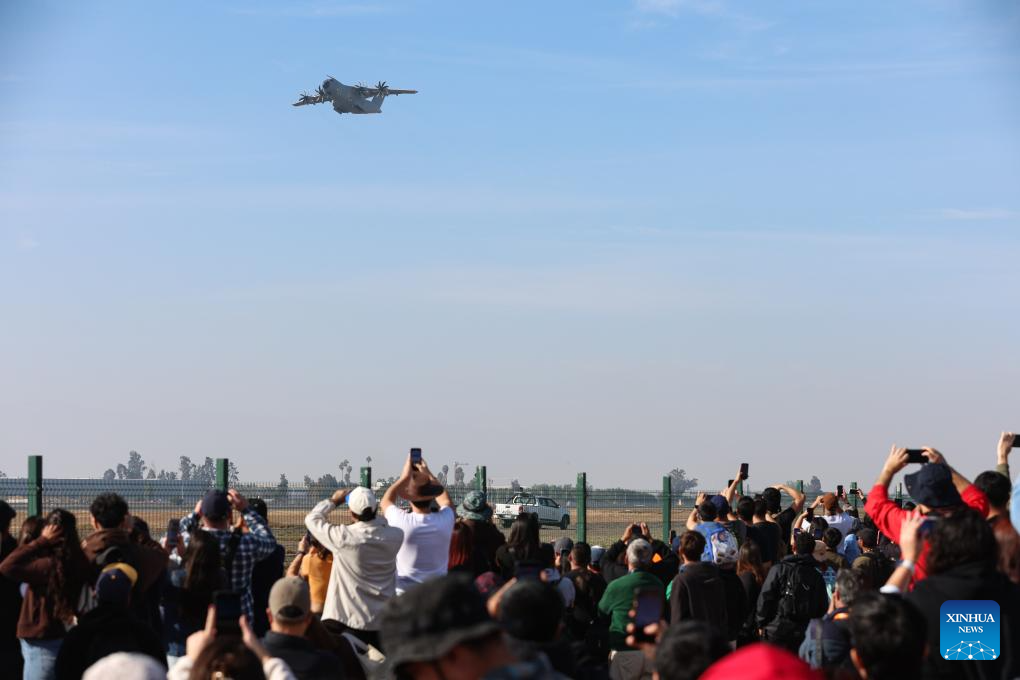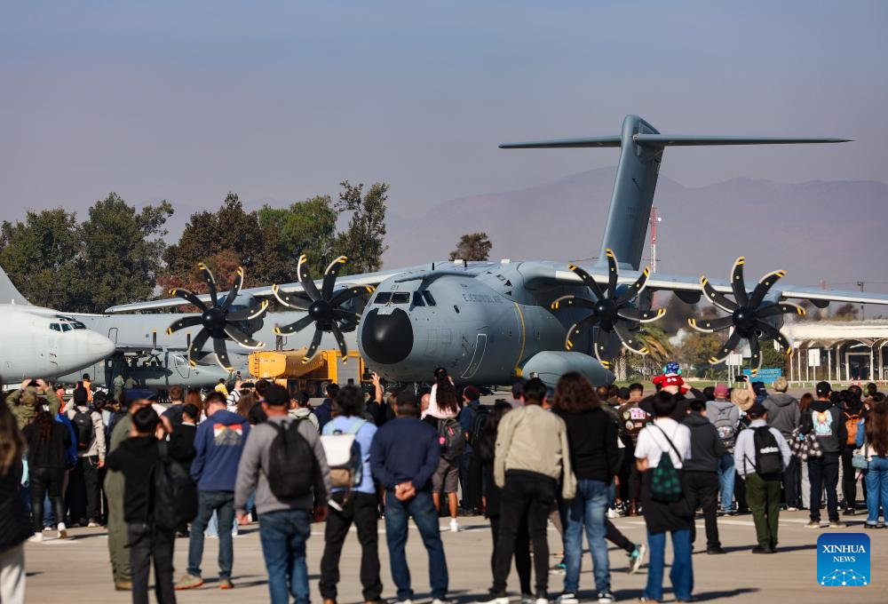 SANTIAGO, 13 abril, 2026 (Xinhua) -- Imagen del 12 de abril de 2026 de un avión de transporte militar Airbus A400M realizando una presentación durante la Feria Internacional del Aire y del Espacio (FIDAE) 2026, en Santiago, capital de Chile. La FIDAE 2026 finalizó aquí el domingo. (Xinhua/Zhou Jiayi)