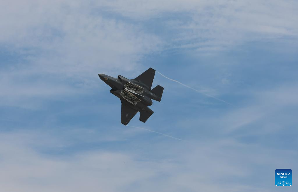 SANTIAGO, 13 abril, 2026 (Xinhua) -- Imagen del 12 de abril de 2026 de un caza F-35 de la Fuerza Aérea de Estados Unidos realizando una presentación durante la Feria Internacional del Aire y del Espacio (FIDAE) 2026, en Santiago, capital de Chile. La FIDAE 2026 finalizó aquí el domingo. (Xinhua/Zhou Jiayi)