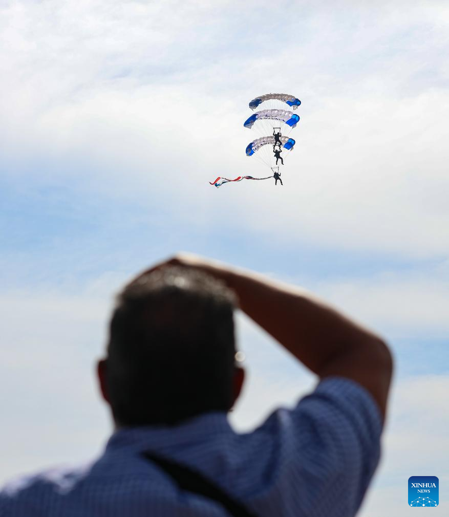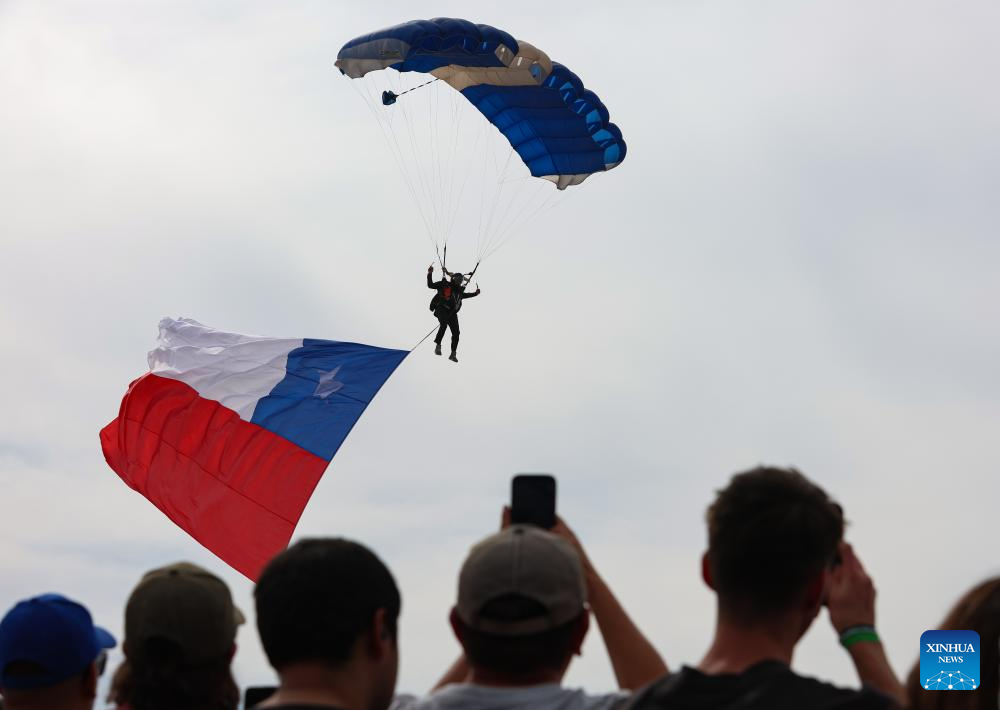 SANTIAGO, 13 abril, 2026 (Xinhua) -- Imagen del 12 de abril de 2026 de personas observando una presentación de paracaidismo en la Feria Internacional del Aire y del Espacio (FIDAE) 2026, en Santiago, capital de Chile. La FIDAE 2026 finalizó aquí el domingo. (Xinhua/Zhou Jiayi)