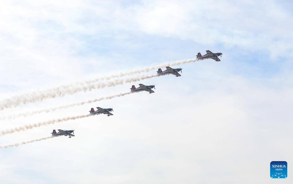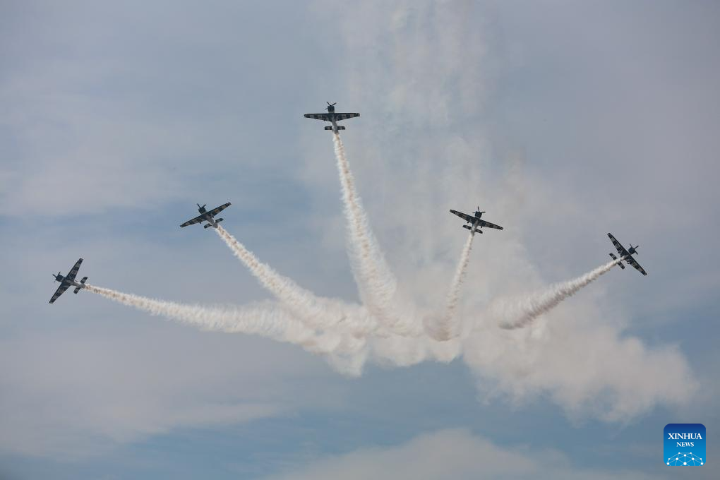 SANTIAGO, 13 abril, 2026 (Xinhua) -- Imagen del 12 de abril de 2026 de aeronaves realizando una presentación durante la Feria Internacional del Aire y del Espacio (FIDAE) 2026, en Santiago, capital de Chile. La FIDAE 2026 finalizó aquí el domingo. (Xinhua/Zhou Jiayi)