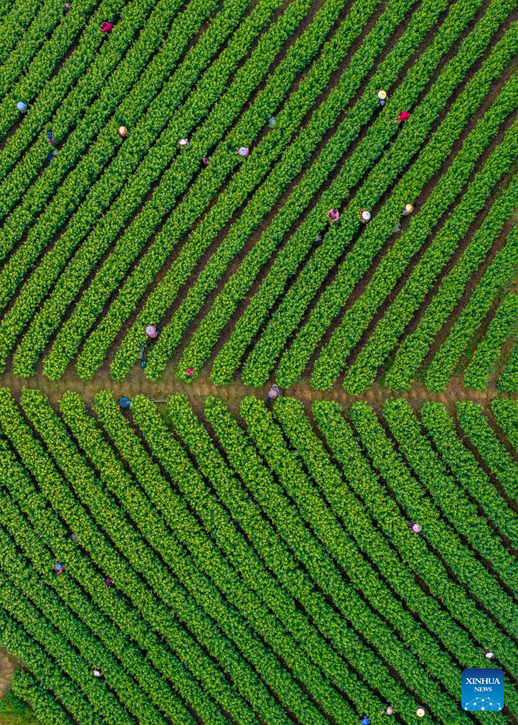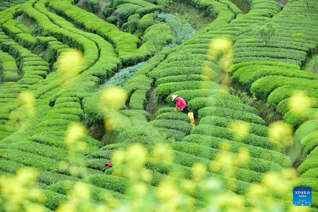 BEIJING, 13 abril, 2026 (Xinhua) -- Vista aérea tomada con un dron el 10 de abril de 2026 de agricultores trabajando en un jardín de té, en la aldea de Beihu del poblado de Moganshan, en la ciudad de Huzhou, en la provincia de Zhejiang, en el este de China. Los agricultores y las empresas de té están ocupados cosechando y procesando las hojas de té de primavera para satisfacer la demanda de los consumidores en estos días. (Xinhua/Xie Shangguo)