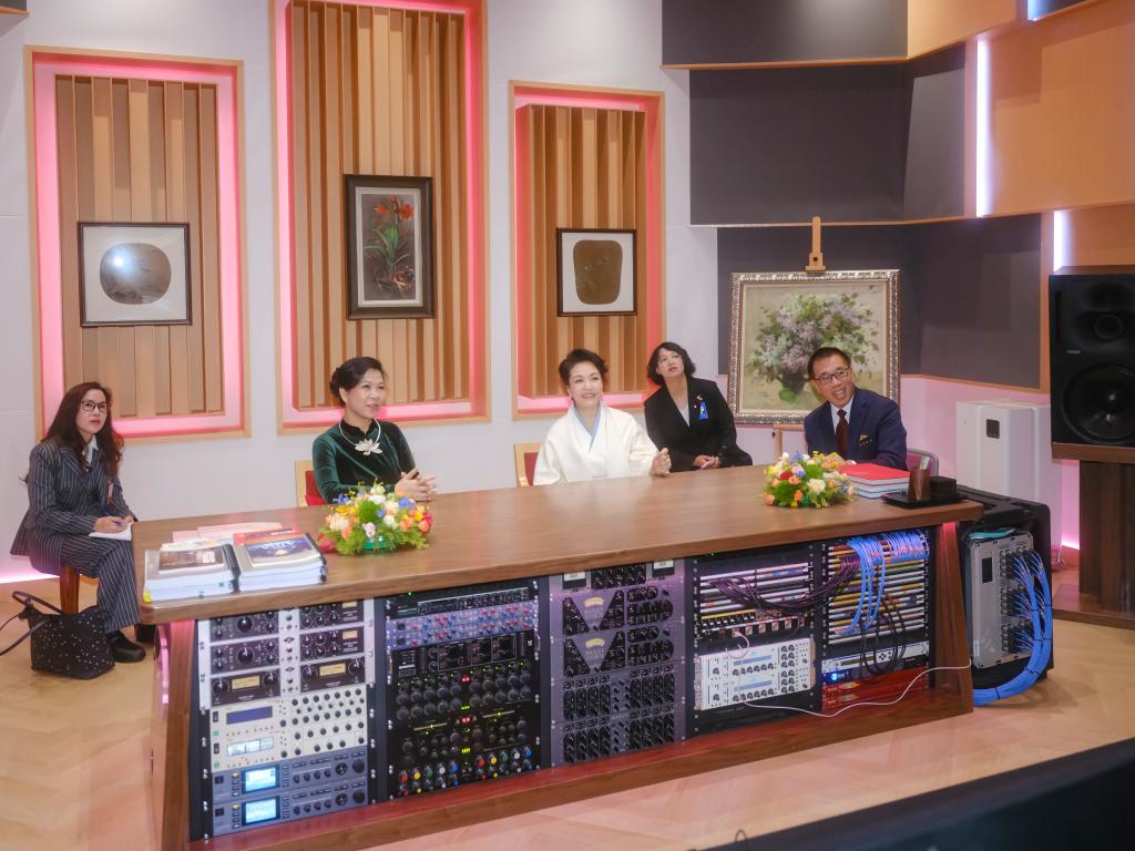 Peng y Ngo Phuong Ly visitaron la sala de ópera, el espacio creativo de realidad virtual y el estudio de grabación, informándose sobre los esfuerzos del CNAE para apoyar la creación artística, ofrecer servicios culturales y llevar a cabo intercambios culturales internacionales. Durante la visita, observaron los ensayos de un drama de danza étnica china y una sesión de grabación de un coro, deteniéndose de vez en cuando para intercambiar opiniones.