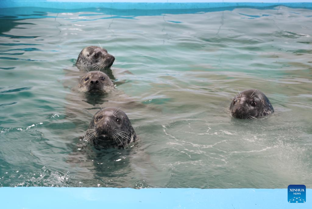 DALIAN, 16 abril, 2026 (Xinhua) -- Imagen del 15 de abril de 2026 de focas manchadas rescatadas, que aún no han sido liberadas al mar debido a su estado de salud, vistas en una piscina del Instituto de Investigación de Ciencias Oceánicas y Pesqueras de Liaoning, en Dalian, en la provincia de Liaoning, en el noreste de China. Cinco focas manchadas fueron liberadas el jueves en aguas frente a la costa de Dalian. Tres de ellas fueron rescatadas y rehabilitadas por el Instituto de Investigación de Ciencias Oceánicas y Pesqueras de Liaoning, mientras que las otras dos fueron criadas artificialmente por Sunasia Ocean World en Dalian. (Xinhua/Han He)