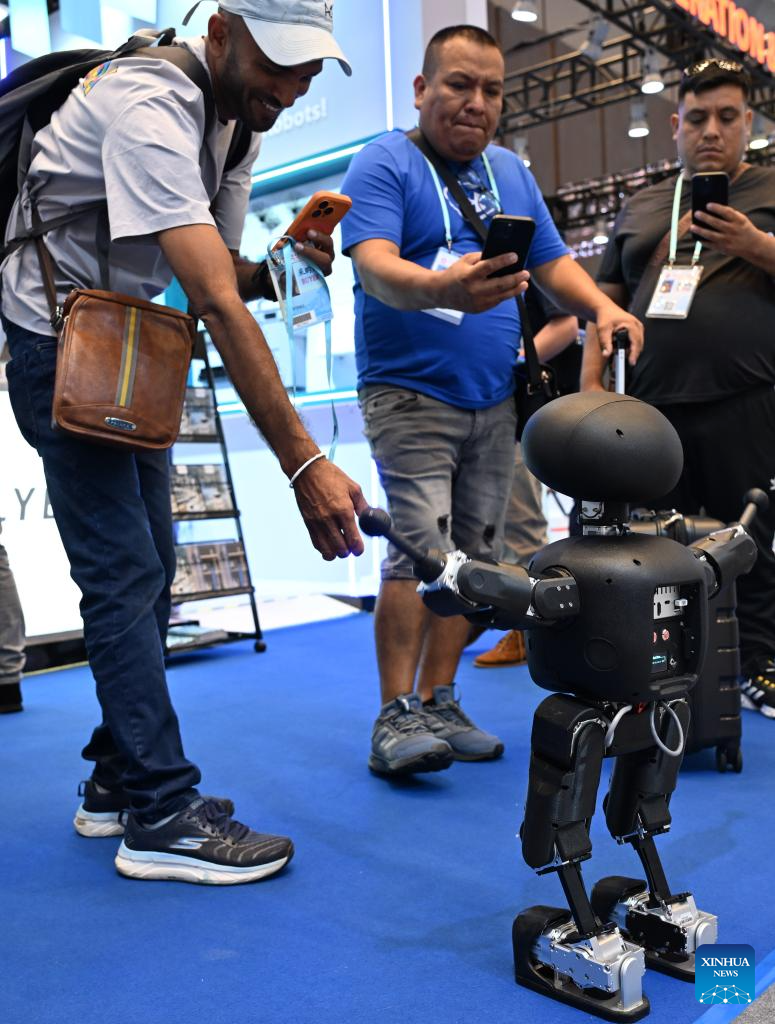 GUANGZHOU, 17 abril, 2026 (Xinhua) -- Imagen del 15 de abril de 2026 de visitantes interactuando con un robot humanoide en la edición número 139 de la Feria de Importación y Exportación de China, en Guangzhou, en la provincia de Guangdong, en el sur de China. La edición número 139 de la Feria de Importación y Exportación de China, también conocida como la Feria de Cantón, se inauguró aquí el miércoles. En el evento se ha habilitado un área de exposición para robots de servicio, que reúne a 46 empresas para mostrar las innovaciones tecnológicas y las capacidades de aplicación del sector de los robots de servicio de China. (Xinhua/Deng Hua)