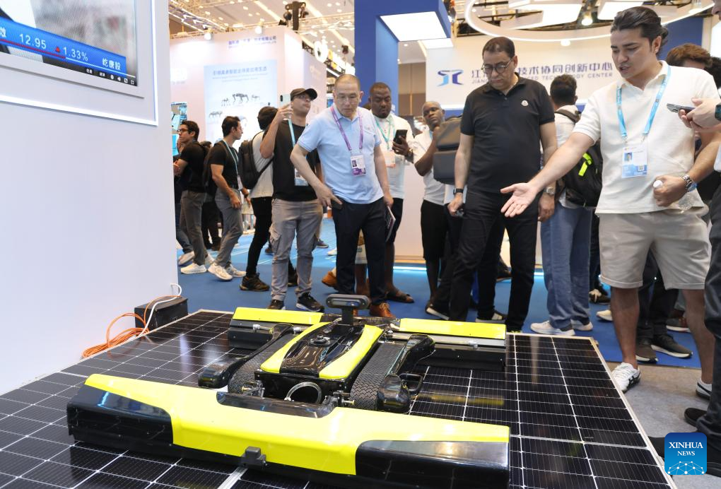 GUANGZHOU, 17 abril, 2026 (Xinhua) -- Imagen del 15 de abril de 2026 de visitantes observando un robot de limpieza con paneles fotovoltaicos en la edición número 139 de la Feria de Importación y Exportación de China, en Guangzhou, en la provincia de Guangdong, en el sur de China. La edición número 139 de la Feria de Importación y Exportación de China, también conocida como la Feria de Cantón, se inauguró aquí el miércoles. En el evento se ha habilitado un área de exposición para robots de servicio, que reúne a 46 empresas para mostrar las innovaciones tecnológicas y las capacidades de aplicación del sector de los robots de servicio de China.(Xinhua/Lu Hanxin)