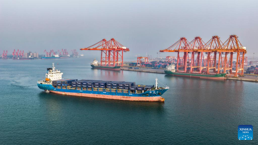 TANGSHAN, 18 abril, 2026 (Xinhua) -- Imagen tomada con un dron el 17 de abril de 2026 de un buque atracando para cargar y descargar contenedores en el área de Jingtang del puerto de Tangshan, en Tangshan, en la provincia de Hebei, en el norte de China. De acuerdo a las autoridades, el volumen de carga del puerto de Tangshan alcanzó los 215,48 millones de toneladas en el primer trimestre de 2026, lo que representa un aumento interanual del 3,67 por ciento. (Xinhua/Liu Mancang)