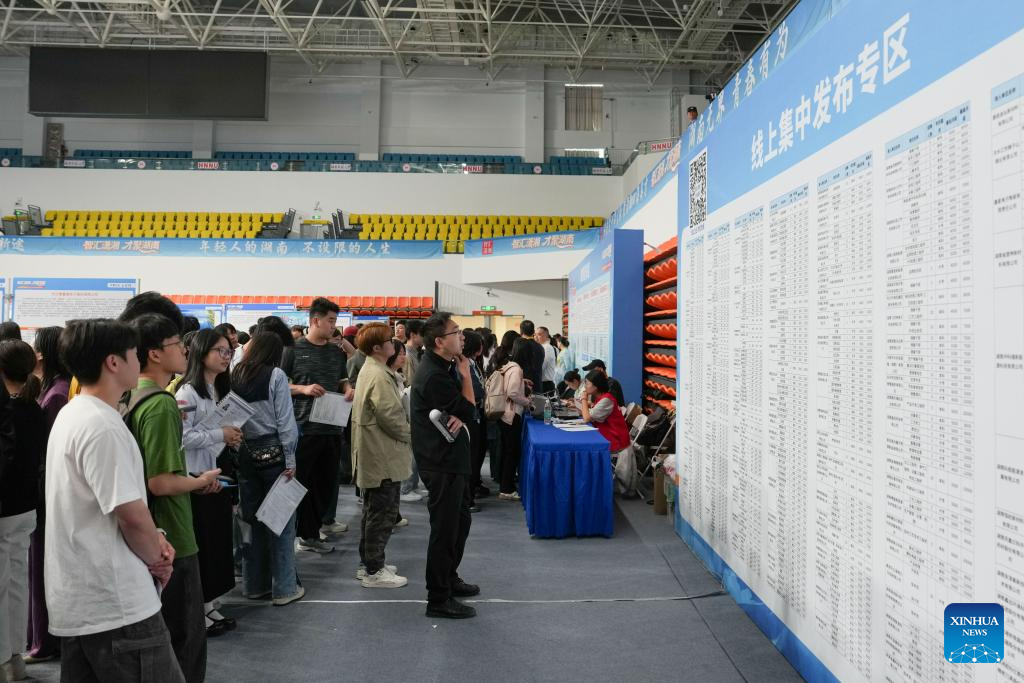 CHANGSHA, 18 abril, 2026 (Xinhua) -- Solicitantes de empleo consultan información sobre vacantes laborales en una feria de empleo celebrada en la Universidad Normal de Hunan, en Changsha, en la provincia de Hunan, en el centro de China, el 18 de abril de 2026. La feria de empleo de dos días para graduados universitarios comenzó el sábado, con las sedes principales en la Universidad de Hunan y la Universidad Normal de Hunan. (Xinhua/Chen Zhenhai)