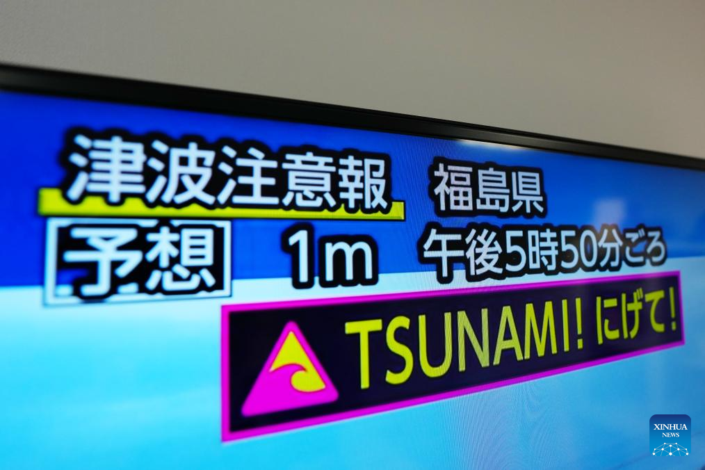 Imagen del 20 de abril de 2026 de una pantalla transmitiendo una alerta de tsunami, en Tokio, Japón. Se han observado olas de tsunami frente a las prefecturas de Iwate y Aomori, en el océano Pacífico, después de que un terremoto de magnitud 7,7 sacudiera la costa de Sanriku, en el noreste de Japón, la tarde del lunes. De acuerdo con la Agencia Meteorológica de Japón, el puerto de Kuji, en la prefectura de Iwate, registró una ola de 80 centímetros.(Xinhua/Jia Haocheng)