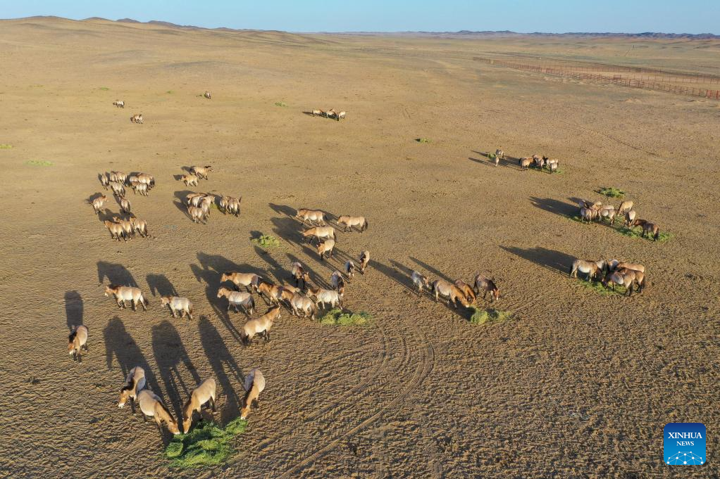 CHANGJI, 22 abril, 2026 (Xinhua) -- Vista aérea tomada con un dron el 21 de abril de 2026 de caballos de Przewalski en una estación de monitoreo en la Reserva Natural de Kalamaili, en la región autónoma uygur de Xinjiang, en el noroeste de China. Un total de 30 caballos de Przewalski fueron reintroducidos con éxito en la Reserva Natural de Kalamaili el miércoles, tras completar su entrenamiento de reintroducción a la vida silvestre. (Xinhua/Ding Lei)