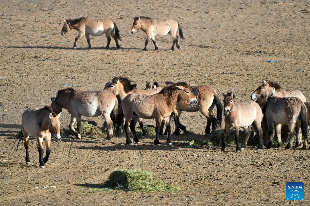 CHANGJI, 22 abril, 2026 (Xinhua) -- Imagen del 4 de febrero de 2026 de caballos de Przewalski pastando en una estación de monitoreo en la Reserva Natural de Kalamaili, en la región autónoma uygur de Xinjiang, en el noroeste de China. Un total de 30 caballos de Przewalski fueron reintroducidos con éxito en la Reserva Natural de Kalamaili el miércoles, tras completar su entrenamiento de reintroducción a la vida silvestre. (Xinhua/Ding Lei)
