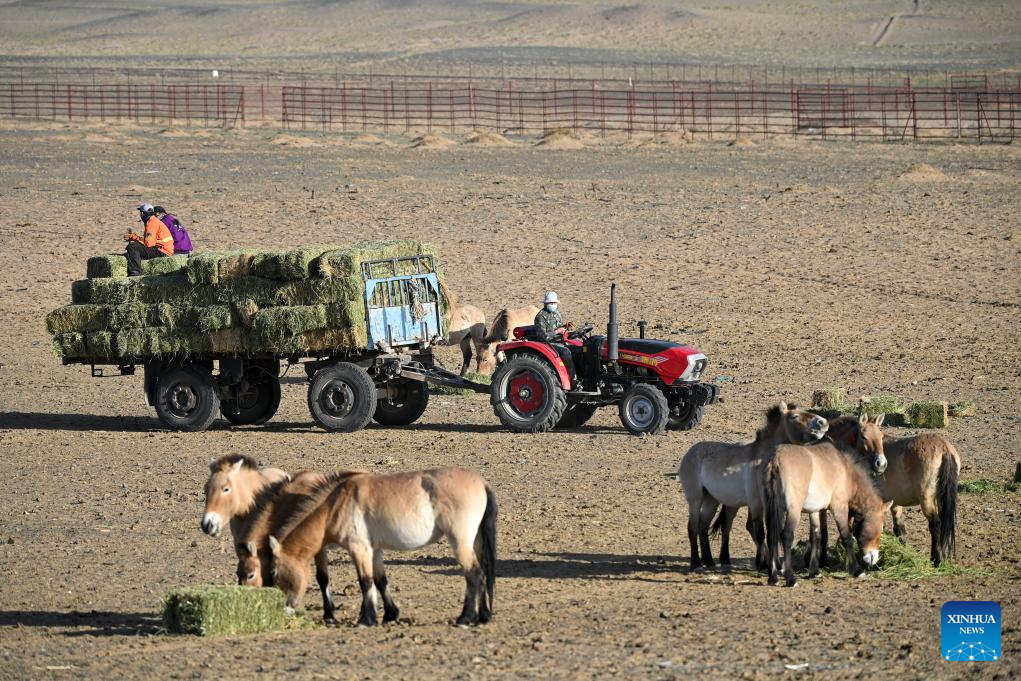 CHANGJI, 22 abril, 2026 (Xinhua) -- Imagen del 21 de abril de 2026 de trabajadores proporcionando forraje a caballos de Przewalski en la Reserva Natural de Kalamaili, en la región autónoma uygur de Xinjiang, en el noroeste de China. Un total de 30 caballos de Przewalski fueron reintroducidos con éxito en la Reserva Natural de Kalamaili el miércoles, tras completar su entrenamiento de reintroducción a la vida silvestre. (Xinhua/Ding Lei)