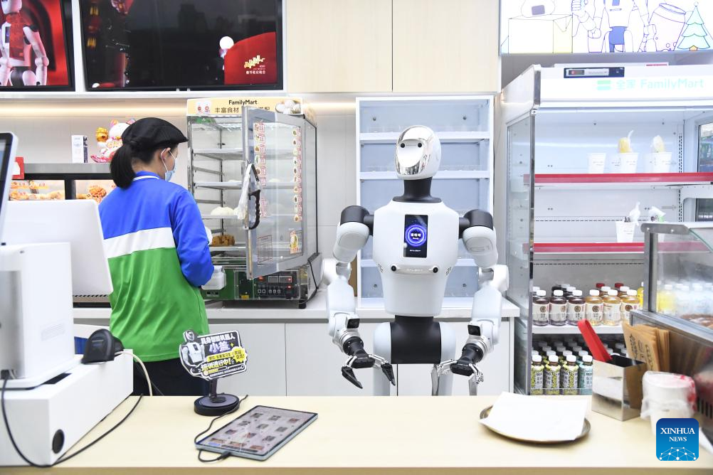 BEIJING, 22 abril, 2026 (Xinhua) -- Un robot humanoide trabaja en una tienda de conveniencia, en el distrito de Haidian de Beijing, capital de China, el 22 de abril de 2026. Un robot humanoide de gran tamaño ha sido instalado recientemente en una tienda de conveniencia en el distrito de Haidian para prestar servicio de forma regular. El robot se encarga de recibir a los clientes, responder a preguntas sobre los productos, proporcionar información sobre promociones y entregar los productos. (Xinhua/Ren Chao)