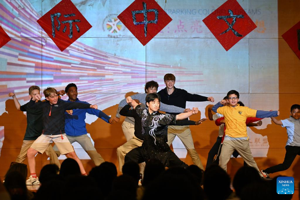 WASHINGTON, 22 abril, 2026 (Xinhua) -- Imagen del 21 de abril de 2026 de un actor de China guiando a estudiantes estadounidenses para realizar una presentación de artes marciales chinas en celebración del Día Internacional de la Lengua China en la Embajada de China, en Washington D. C., Estados Unidos. (Xinhua/Li Rui)