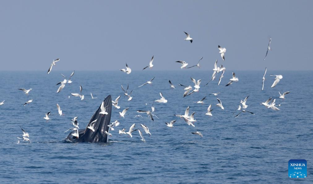 NANNING, 23 abril, 2026 (Xinhua) -- Imagen del 14 de enero de 2026 de un rorcual de Bryde avistado frente a la isla de Weizhou, en la ciudad de Beihai, en la región autónoma de la etnia zhuang de Guangxi, en el sur de China. Los rorcuales de Bryde, una especie protegida de primera categoría en China que puede alcanzar los 15 metros de longitud y pesar hasta 20 toneladas, prácticamente habían desaparecido de estas aguas durante décadas. Pero ahora, este tramo del golfo es el único lugar costero conocido del país donde los animales aparecen de forma regular cada año, llegando en diciembre y permaneciendo hasta abril. (Xinhua/Academia de Ciencias de Guangxi)