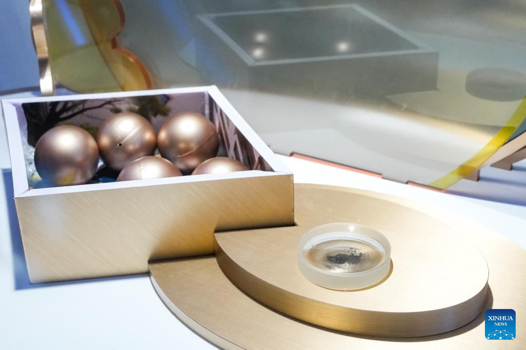 CHENGDU, 24 abril, 2026 (Xinhua) -- Imagen del 24 de abril de 2026 de una muestra lunar recolectada por la misión Chang'e-5 de China, en una exposición de ciencia aeroespacial, en Chengdu, en la provincia de Sichuan, en el suroeste de China. Un evento para conmemorar el 11º Día del Espacio de China comenzó en Chengdu el viernes, bajo el lema "Un Camino Celestial de Siete Décadas, Una Fe Compartida en el Cosmos". (Xinhua/Wang Xi)