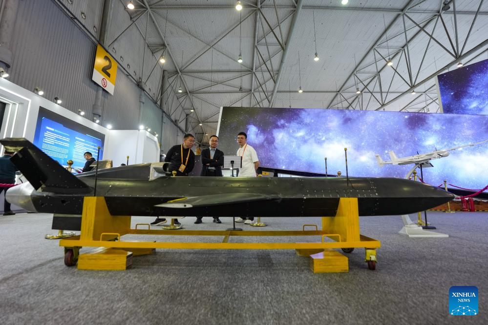 CHENGDU, 24 abril, 2026 (Xinhua) -- Invitados observan un dron exhibido en una exposición de ciencia aeroespacial, en Chengdu, en la provincia de Sichuan, en el suroeste de China, el 24 de abril de 2026. Un evento para conmemorar el 11º Día del Espacio de China comenzó en Chengdu el viernes, bajo el lema "Un Camino Celestial de Siete Décadas, Una Fe Compartida en el Cosmos". (Xinhua/Wang Xi)