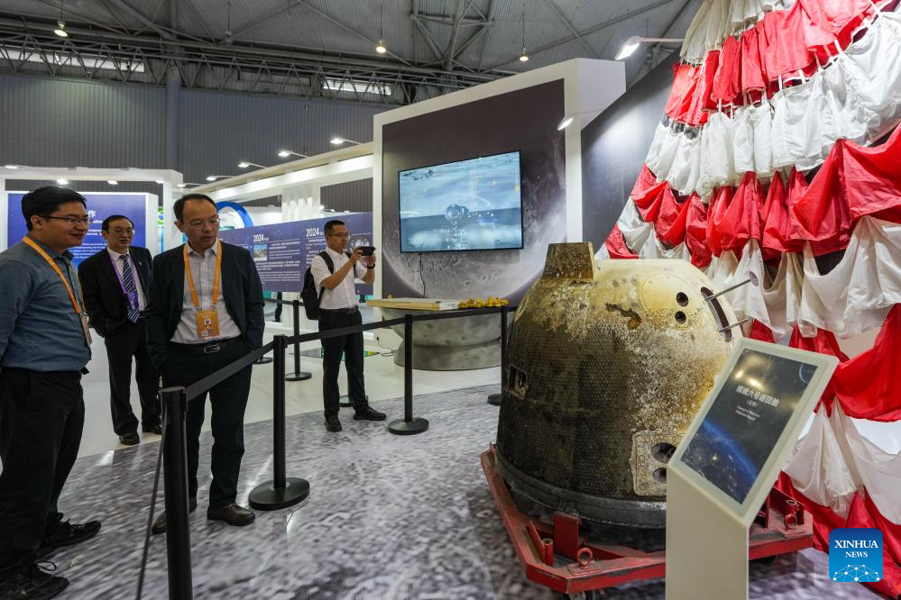 CHENGDU, 24 abril, 2026 (Xinhua) -- Invitados observan la cápsula de retorno de la Chang'e-6 exhibida en una exposición de ciencia aeroespacial, en Chengdu, en la provincia de Sichuan, en el suroeste de China, el 24 de abril de 2026. Un evento para conmemorar el 11º Día del Espacio de China comenzó en Chengdu el viernes, bajo el lema "Un Camino Celestial de Siete Décadas, Una Fe Compartida en el Cosmos". (Xinhua/Wang Xi)