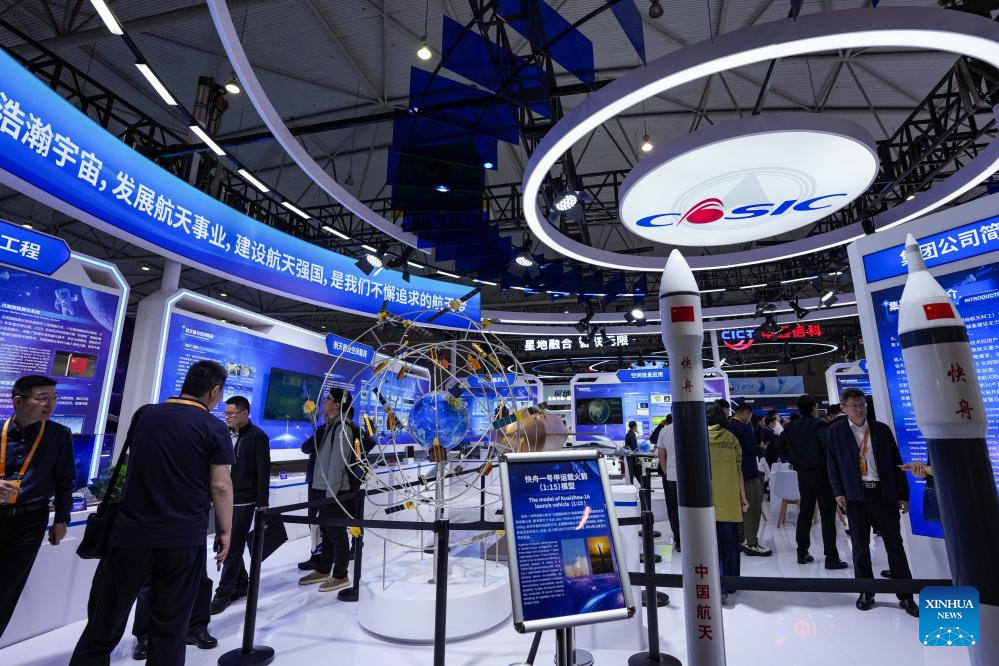 CHENGDU, 24 abril, 2026 (Xinhua) -- Invitados visitan una exposición de ciencia aeroespacial, en Chengdu, en la provincia de Sichuan, en el suroeste de China, el 24 de abril de 2026. Un evento para conmemorar el 11º Día del Espacio de China comenzó en Chengdu el viernes, bajo el lema "Un Camino Celestial de Siete Décadas, Una Fe Compartida en el Cosmos". (Xinhua/Wang Xi)