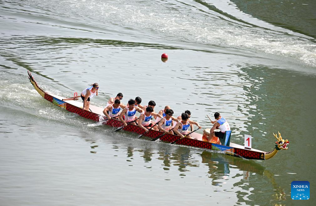 SANYA, 25 abril, 2026 (Xinhua) -- El equipo de China compite durante la final de la carrera de 200 m en línea recta femenina para botes pequeños del evento de botes del dragón en los VI Juegos Asiáticos de Playa, en Sanya, en la provincia de Hainan, en el sur de China, el 25 de abril de 2026. (Xinhua/Yang Guanyu)