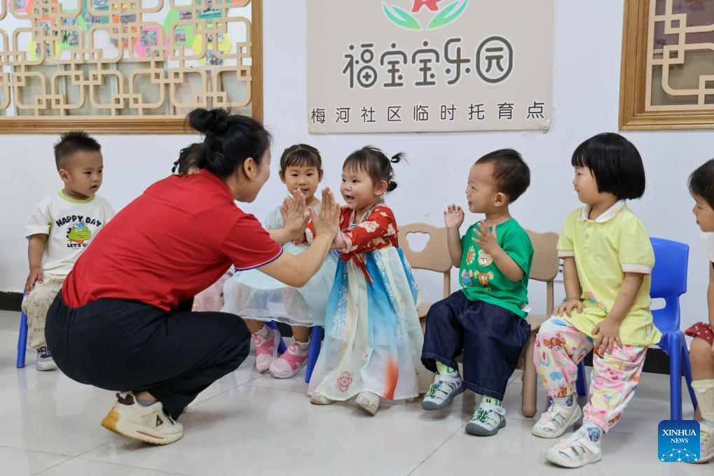 SHENZHEN, 27 abril, 2026 (Xinhua) -- Imagen del 17 de abril de 2026 de una maestra jugando con niños en una guardería de la comunidad de Meihe del distrito de Futian, en Shenzhen, en la provincia de Guangdong, en el sur de China. Shenzhen está creando un "círculo de guarderías de 15 minutos" que abarca los primeros 1.000 días de vida del niño para aliviar la carga de las familias y fomentar el aumento de la natalidad. (Xinhua/Liang Xu)