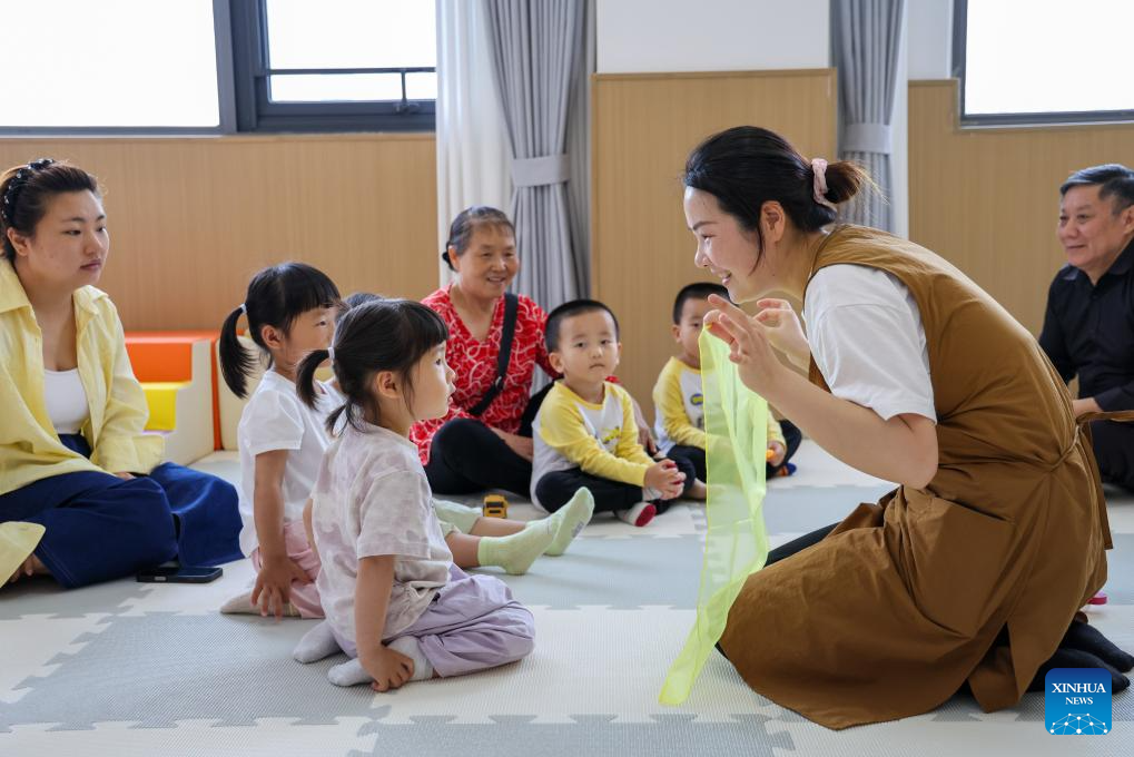 SHENZHEN, 27 abril, 2026 (Xinhua) -- Imagen del 15 de abril de 2026 de una maestra jugando con niños en una guardería de la comunidad de Minkang del distrito de Longhua, en Shenzhen, en la provincia de Guangdong, en el sur de China. Shenzhen está creando un "círculo de guarderías de 15 minutos" que abarca los primeros 1.000 días de vida del niño para aliviar la carga de las familias y fomentar el aumento de la natalidad. (Xinhua/Liang Xu)